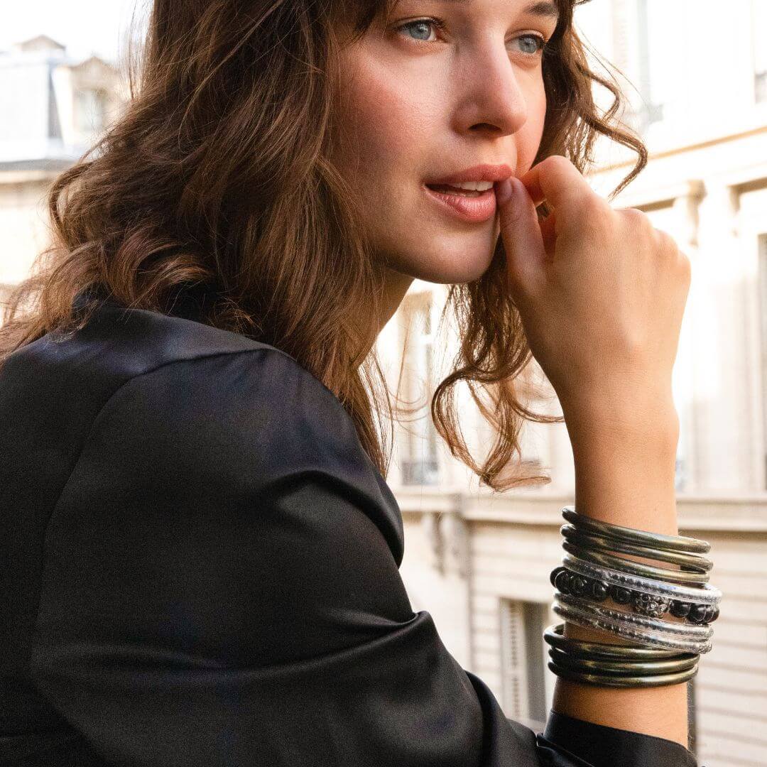 Si dice che i nostri Black Spinel Three Queens All Weather Bangles® vi invitino a creare un bellissimo paesaggio per i polsi™ che vi guidi alla calma e che emani energia vibrazionale radicante.