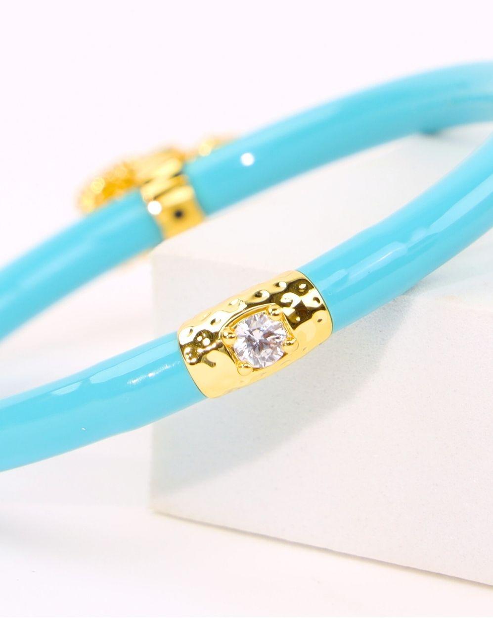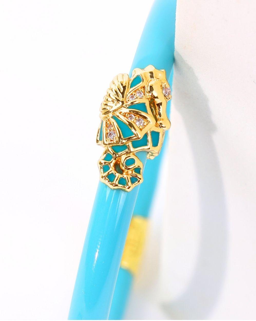Channel the serene strength of the sea with our Turquoise Seahorse All Weather Bangle. A symbol of patience and grace, this elegant bangle features a gold-plated seahorse adorned with vibrant turquoise enamel and sparkling crystal eyes. This handcrafted piece wraps beautifully around our signature all-weather tubing, offering a daily reminder to navigate life’s currents with a calm heart. It’s more than just a beautiful accessory; it's a talisman of tranquility and inner strength.