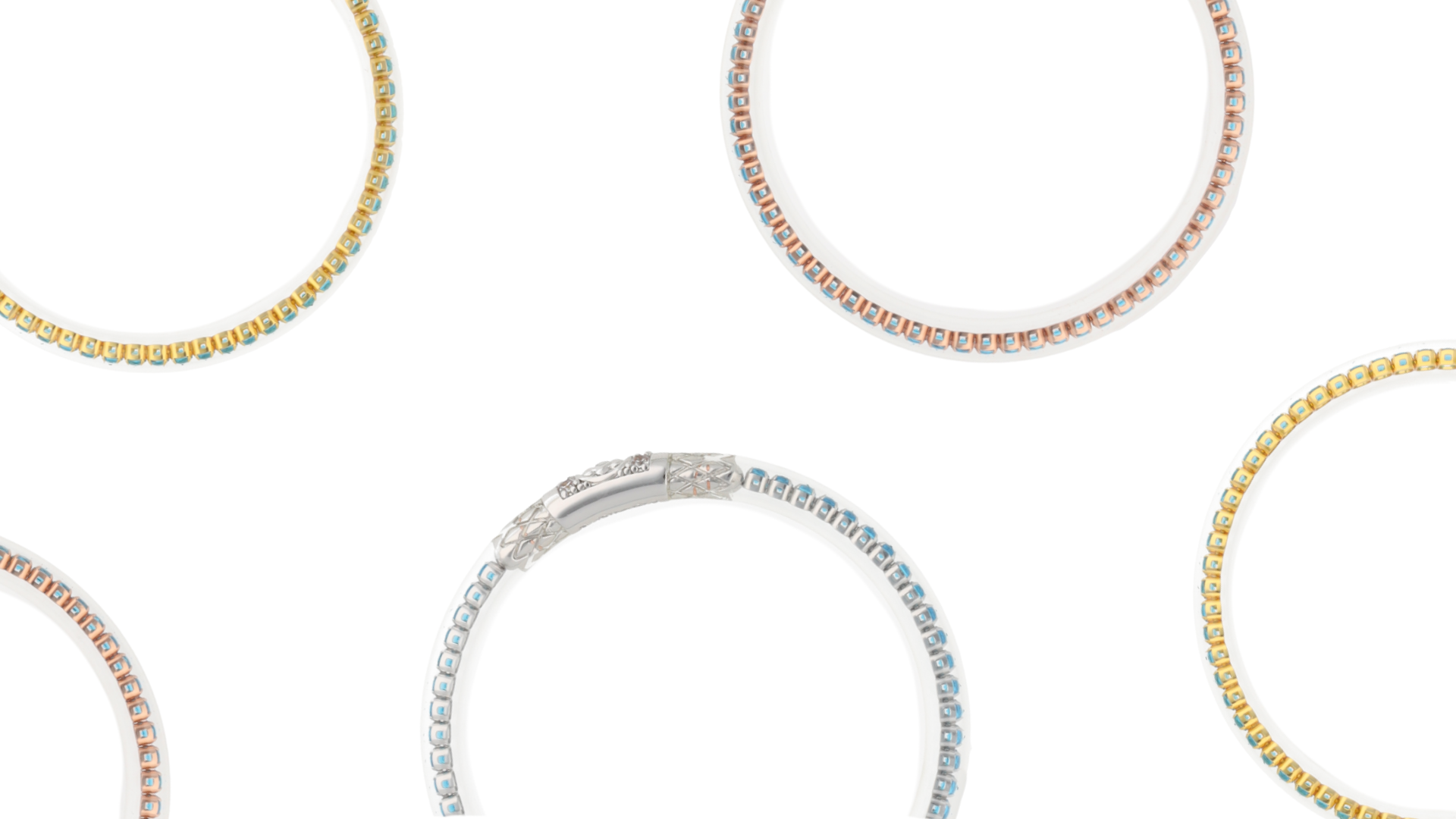 The most serene shade of tranquil aqua is ensconced in our crystal-clear tubing, sealed with our signature Three Queens bead in gold to reflect sunlight on water, in white gold to echo the shimmer of moonlit waves, and in rose gold to mirror the first blush of morning tide.
